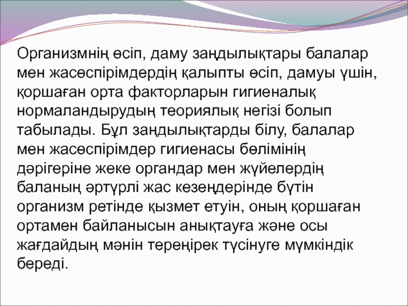 Слайд 10Организмнің өсіп, даму заңдылықтары балалар мен жасөспірімдердің қалыпты өсіп, дамуы