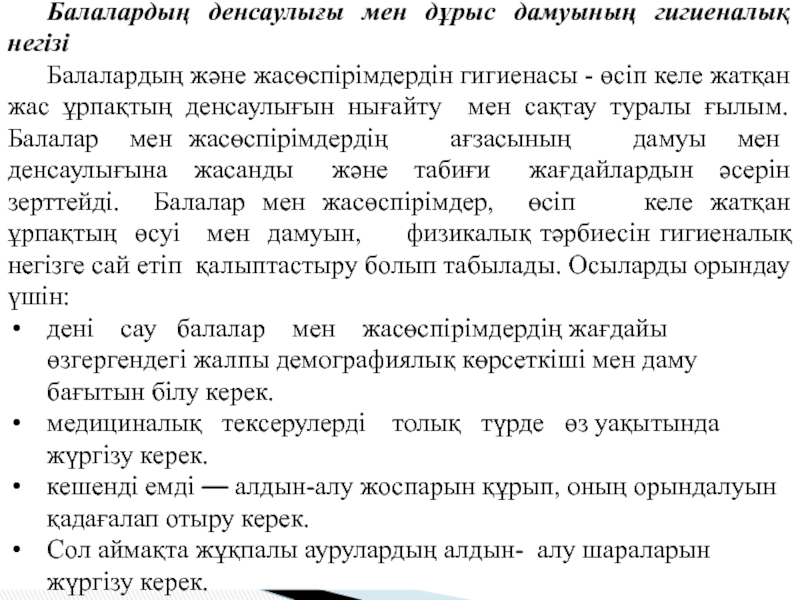 Слайд 6Балалардың денсаулығы мен дұрыс дамуының гигиеналық негізі