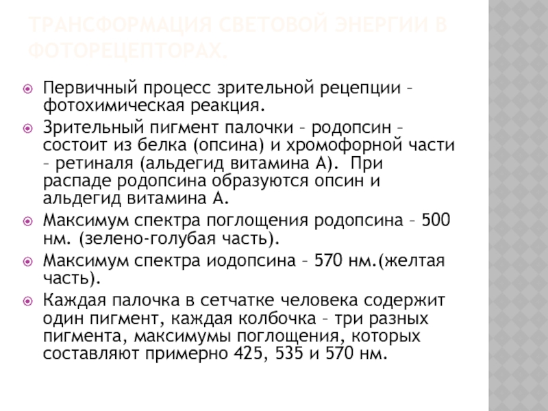 Каждая палочка в сетчатке человека содержит один пигмент, каждая колбочка – три разных пигмента, максимумы поглощения, которых составляют примерно 425, 535 и 570 нм.