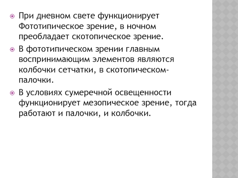Слайд 16При дневном свете функционирует Фототипическое зрение, в ночном преобладает скотопическое