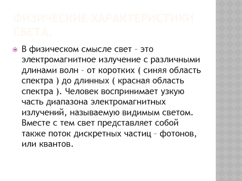 спектра ) до длинных ( красная область спектра ). Человек воспринимает узкую часть диапазона электромагнитных излучений, называемую видимым светом. Вместе с тем свет представляет собой также поток дискретных частиц – фотонов, или квантов.