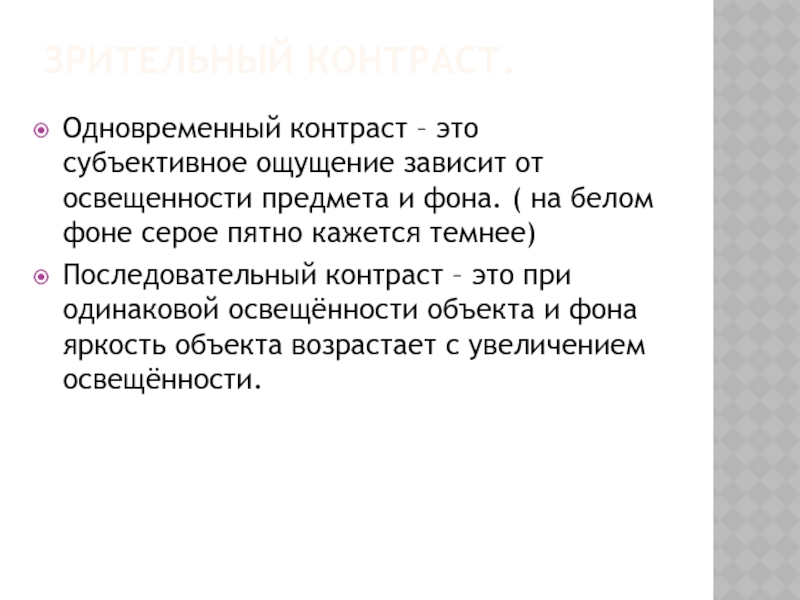Последовательный контраст – это при одинаковой освещённости объекта и фона яркость объекта возрастает с увеличением освещённости.