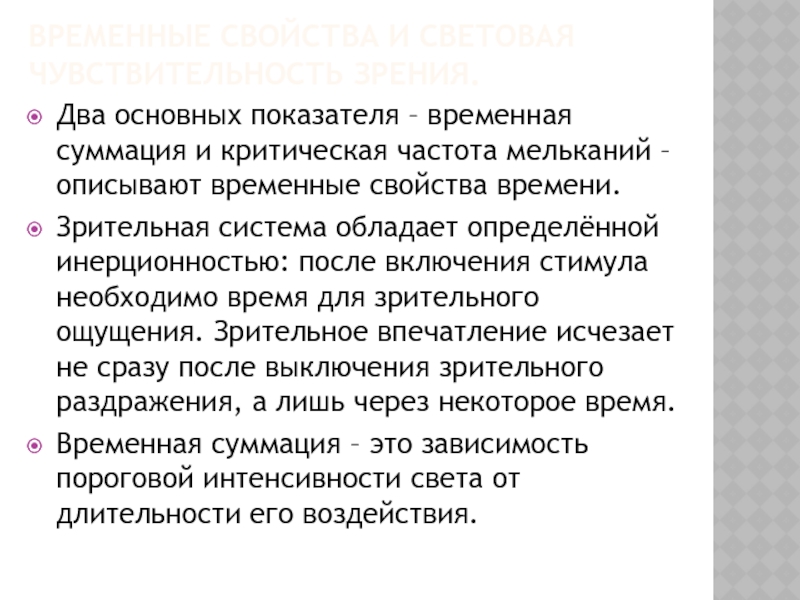 суммация и критическая частота мельканий – описывают временные свойства времени.