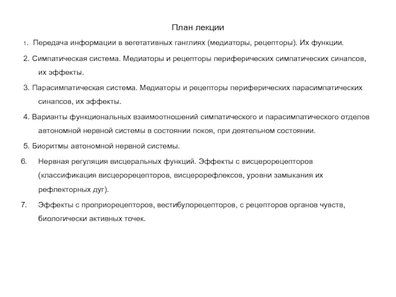1. Передача информации в вегетативных ганглиях (медиаторы, рецепторы). Их