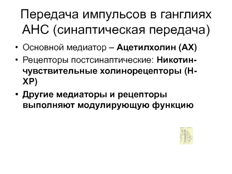 Слайд 10Передача импульсов в ганглиях АНС (синаптическая передача)