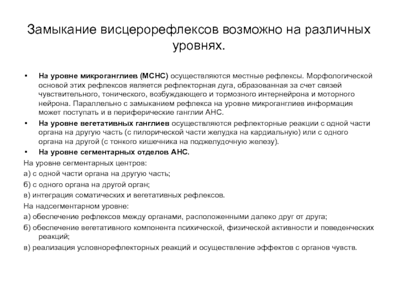 Слайд 29Замыкание висцерорефлексов возможно на различных уровнях.