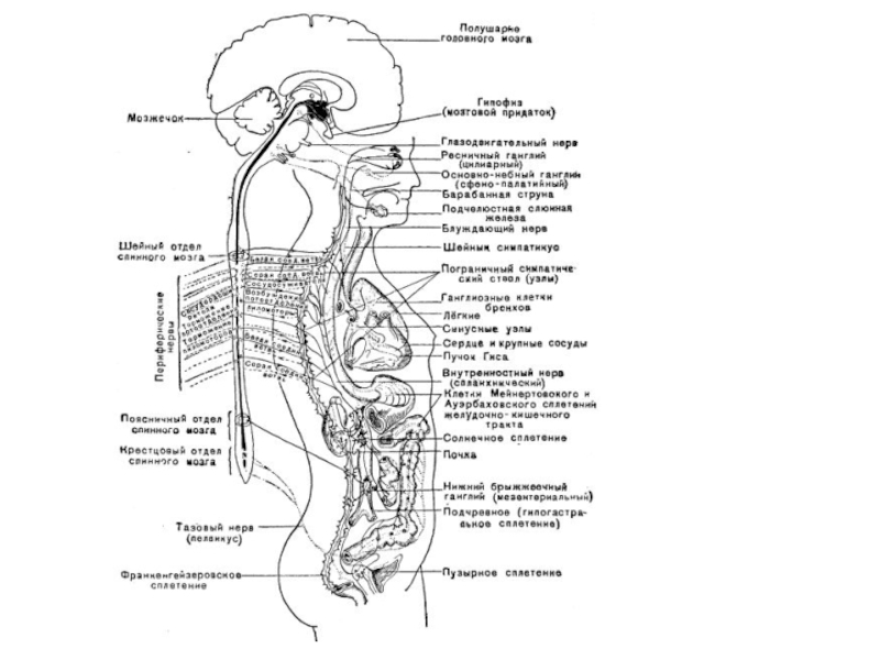 вегетативные ганглии, сегментарные и надсегментарные отделы АНС.