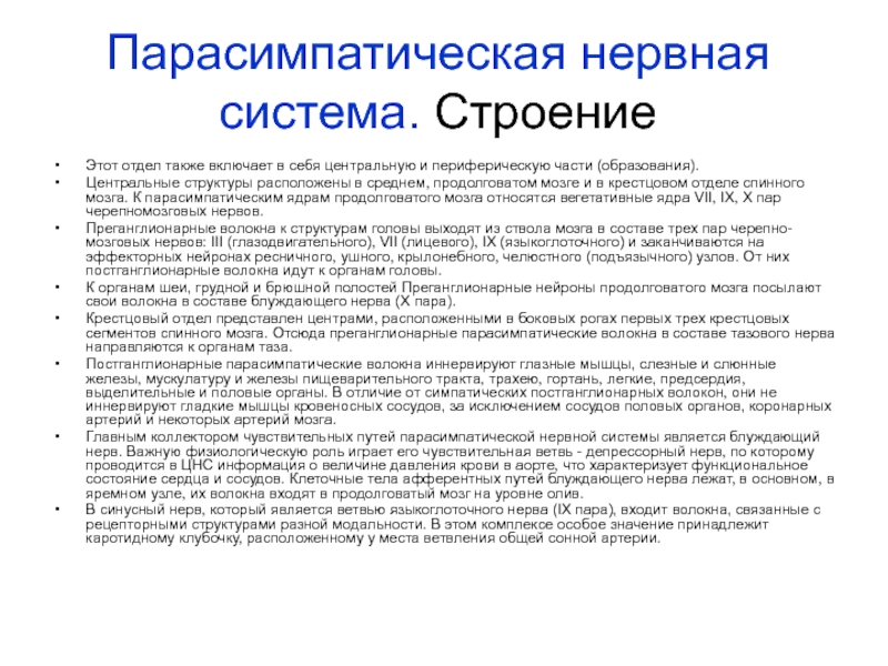 и в крестцовом отделе спинного мозга. К парасимпатическим ядрам продолговатого мозга относятся вегетативные ядра VII, IX, Х пар черепномозговых нервов.