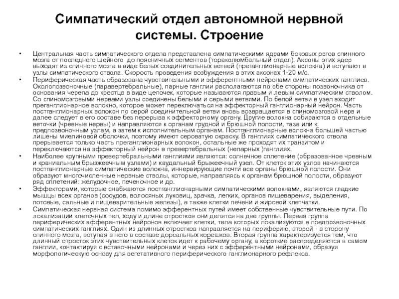 поясничных сегментов (тораколюмбальный отдел). Аксоны этих ядер выходят из спинного мозга в виде белых соединительных ветвей (преганглионарные волокна) и вступают в узлы симпатического ствола. Скорость проведения возбуждения в этих аксонах 1-20 м/с.