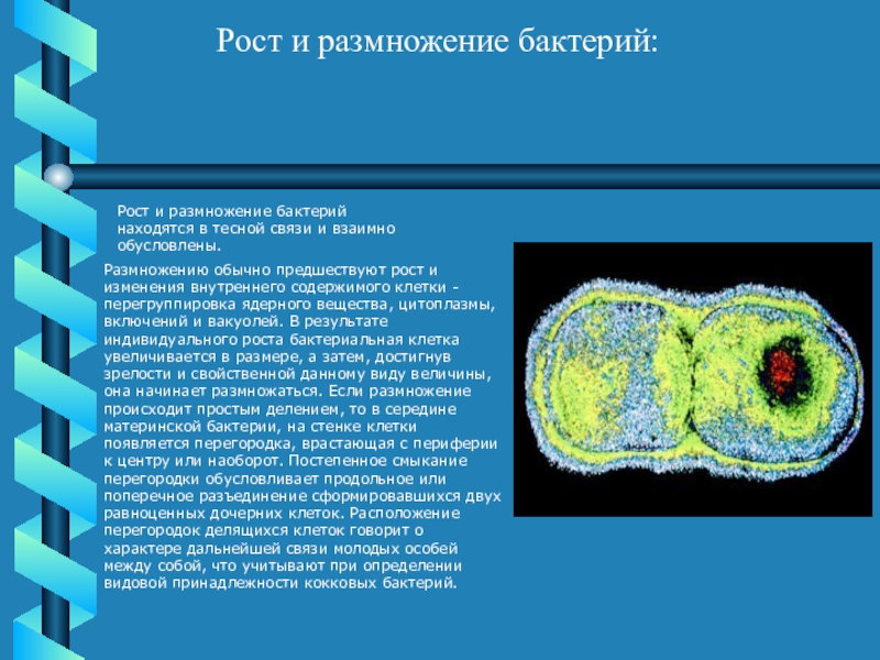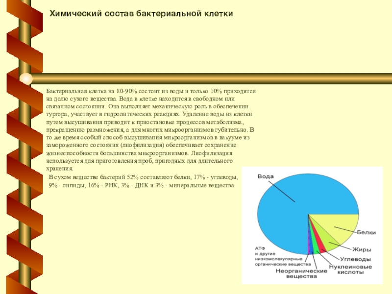 клетке находится в свободном или связанном состоянии. Она выполняет механическую роль в обеспечении тургора, участвует в гидролитических реакциях. Удаление воды из клетки путем высушивания приводит к приостановке процессов метаболизма, прекращению размножения, а для многих микроорганизмов губительно. В то же время особый способ высушивания микроорганизмов в вакууме из замороженного состояния (лиофилизация) обеспечивает сохранение жизнеспособности большинства микроорганизмов. Лиофилизация используется для приготовления проб, пригодных для длительного хранения.В сухом веществе бактерий 52% составляют белки, 17% - углеводы, 9% - липиды, 16% - РНК, 3% - ДНК и 3% - минеральные вещества.