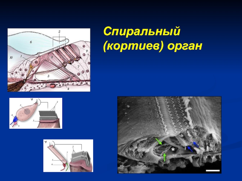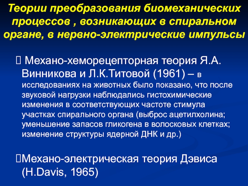 энергии звуковых колебаний в нервное возбуждение рецепторов спирального органа, передающееся в кору головного мозга (волосковые клетки кортиева органа, проводящие пути слухового анализатора, слуховая кора).