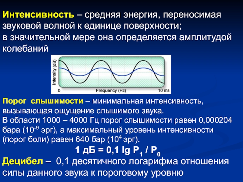 В области 1000 – 4000 Гц порог слышимости равен 0,000204 бара (10-9 эрг), а максимальный уровень интенсивности (порог боли) равен 640 бар (104 эрг).