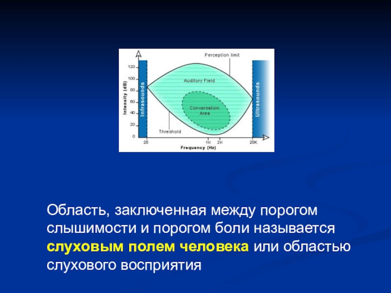 Слайд 6Область, заключенная между порогом слышимости и порогом боли называется слуховым