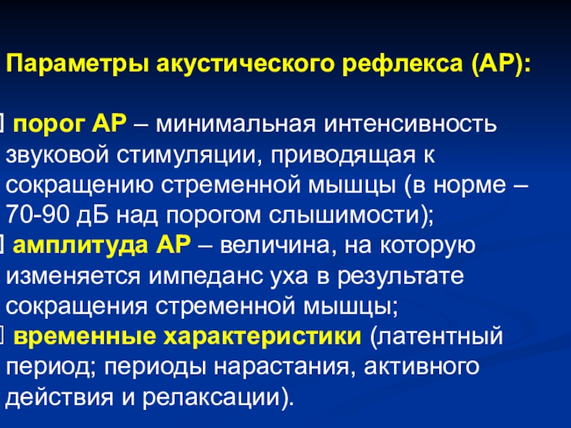 Слайд 45Параметры акустического рефлекса (АР):