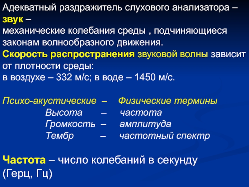Слайд 2Адекватный раздражитель слухового анализатора – звук –