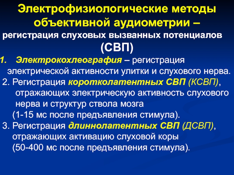 Слайд 36Электрофизиологические методы объективной аудиометрии –