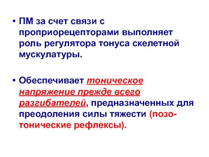Слайд 9ПМ за счет связи с проприорецепторами выполняет роль регулятора тонуса
