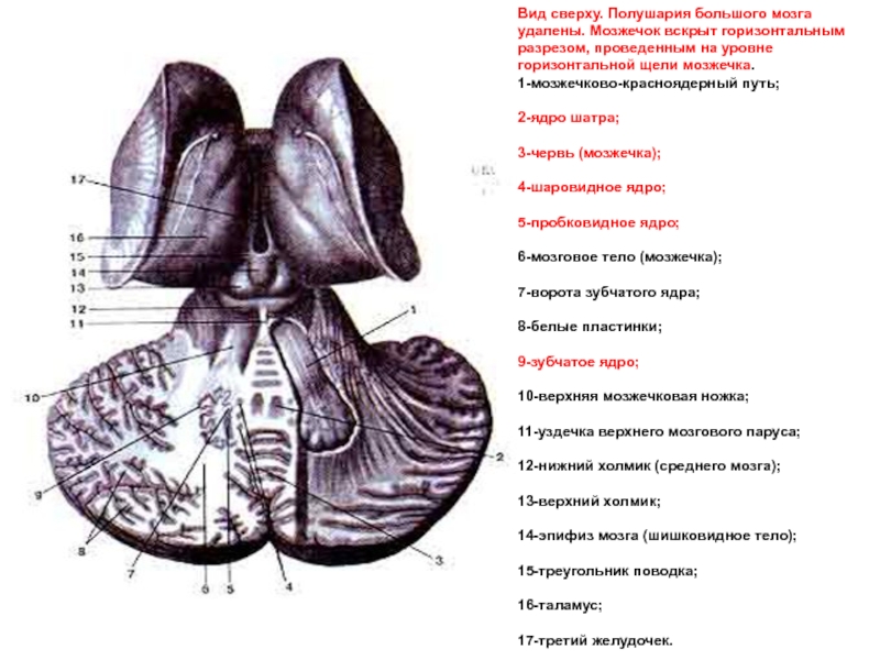 Слайд 39Вид сверху. Полушария большого мозга удалены. Мозжечок вскрыт горизонтальным разрезом,