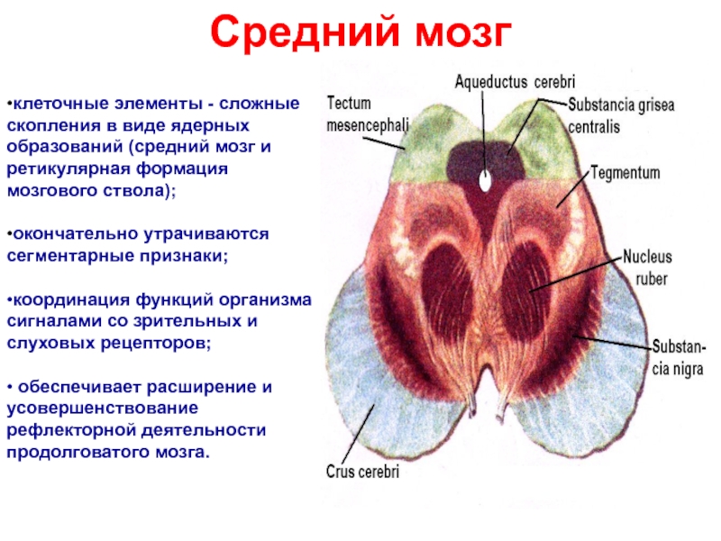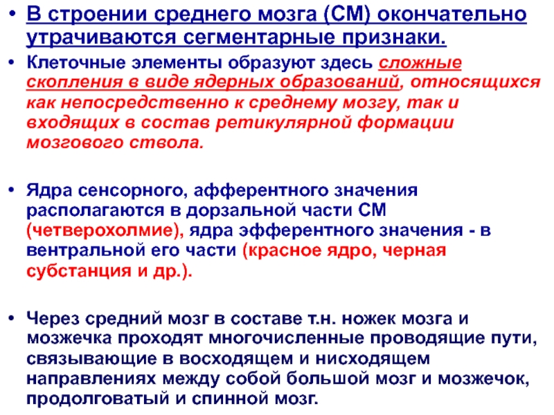 Слайд 20В строении среднего мозга (СМ) окончательно утрачиваются сегментарные признаки.