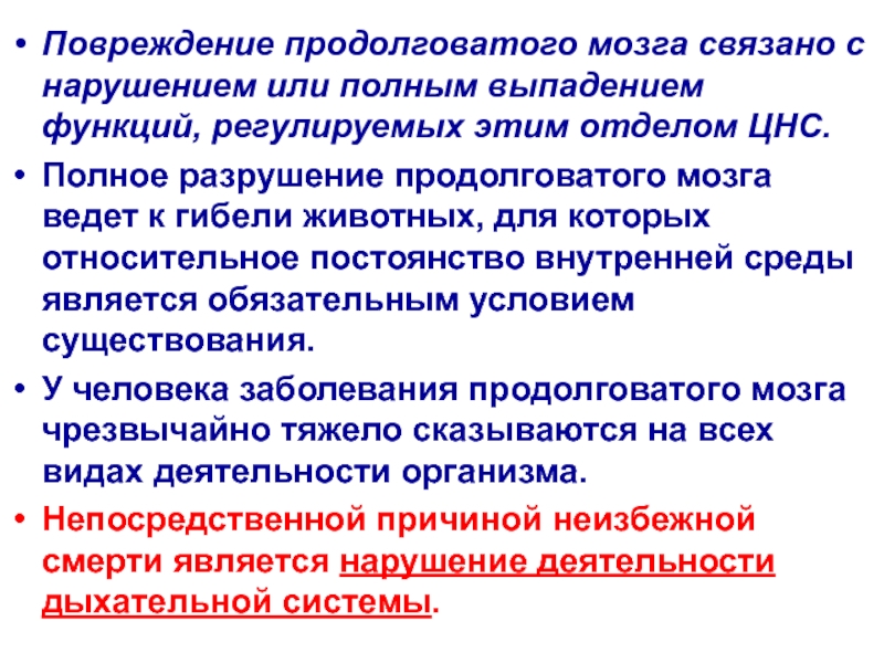 Слайд 18Повреждение продолговатого мозга связано с нарушением или полным выпадением функций,