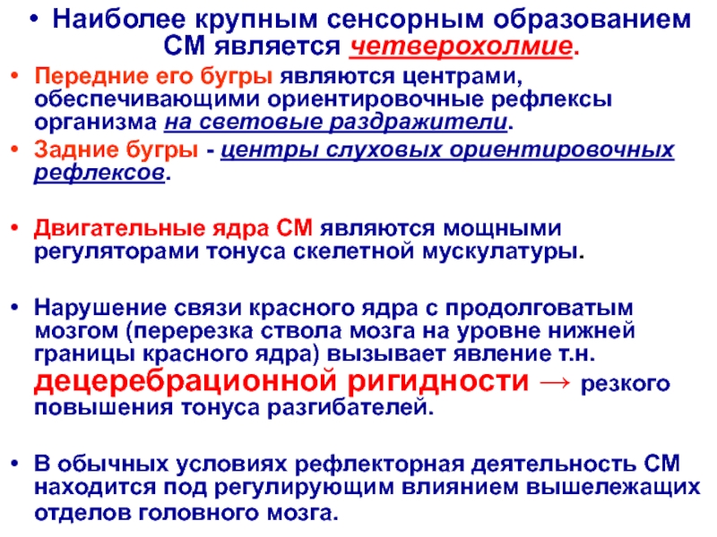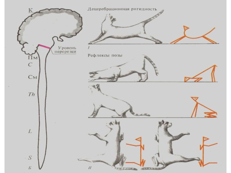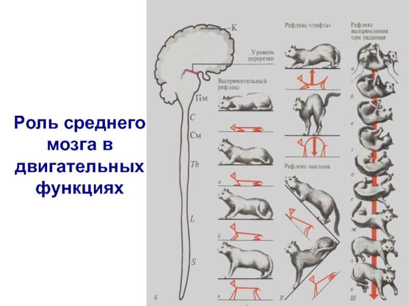 Слайд 26Важная группа рефлексов среднего мозга → установочные (выпрямительные) рефлексы (рефлексы