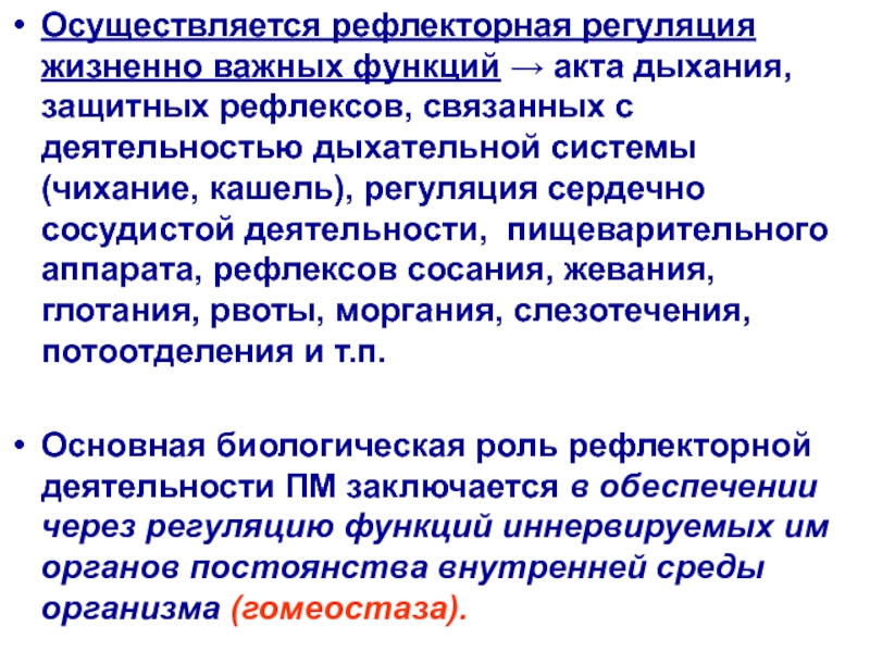 Основная биологическая роль рефлекторной деятельности ПМ заключается в обеспечении через регуляцию функций иннервируемых им органов постоянства внутренней среды организма (гомеостаза).
