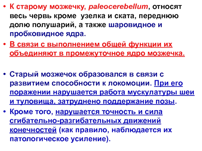 Слайд 36К старому мозжечку, paleocerebellum, относят весь червь кроме узелка и
