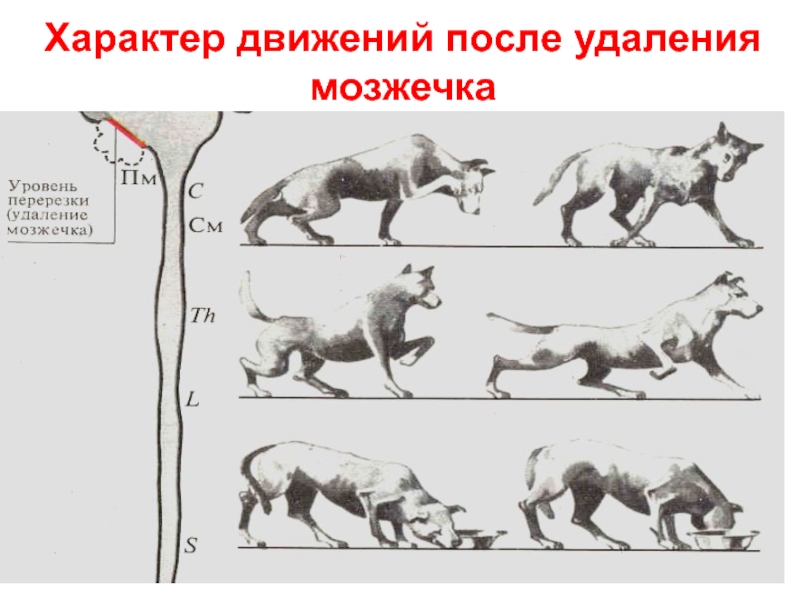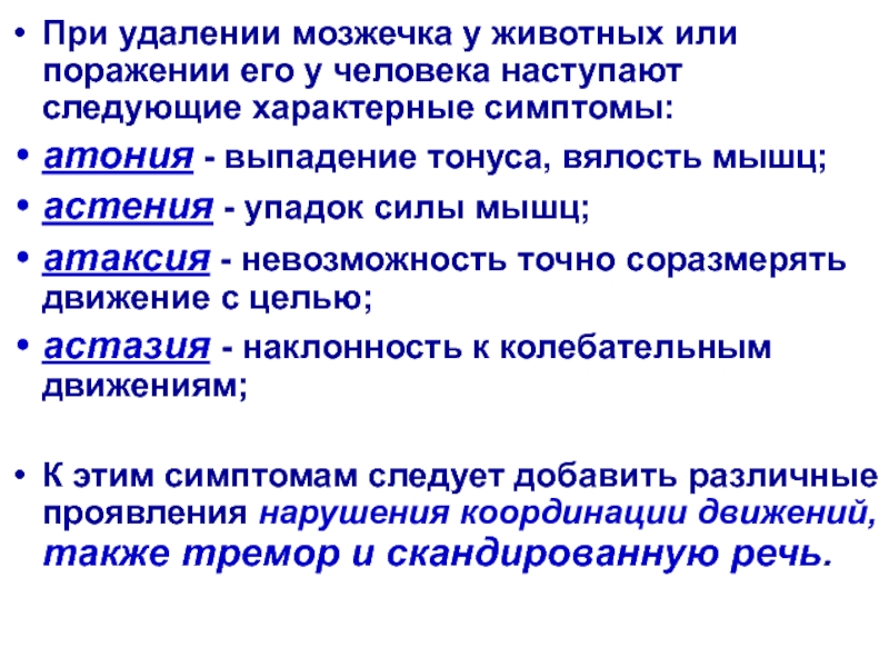 Слайд 41При удалении мозжечка у животных или поражении его у человека