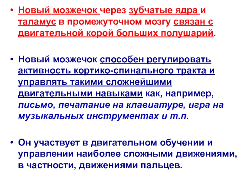 Слайд 38Новый мозжечок через зубчатые ядра и таламус в промежуточном мозгу