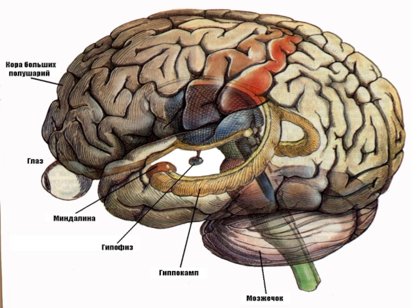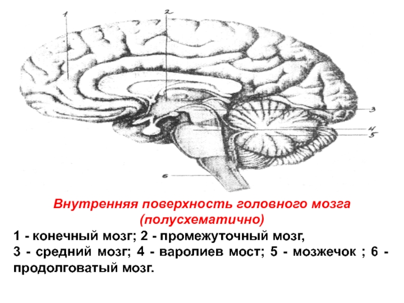 Слайд 3Внутренняя поверхность головного мозга (полусхематично)