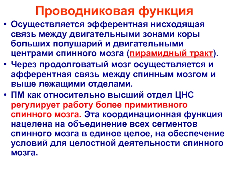 ПМ как относительно высший отдел ЦНС регулирует работу более примитивного спинного мозга. Эта координационная функция нацелена на объединение всех сегментов спинного мозга в единое целое, на обеспечение условий для целостной деятельности спинного мозга.