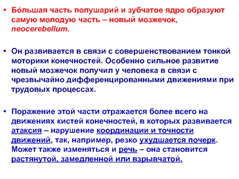 Слайд 37Бóльшая часть полушарий и зубчатое ядро образуют самую молодую часть