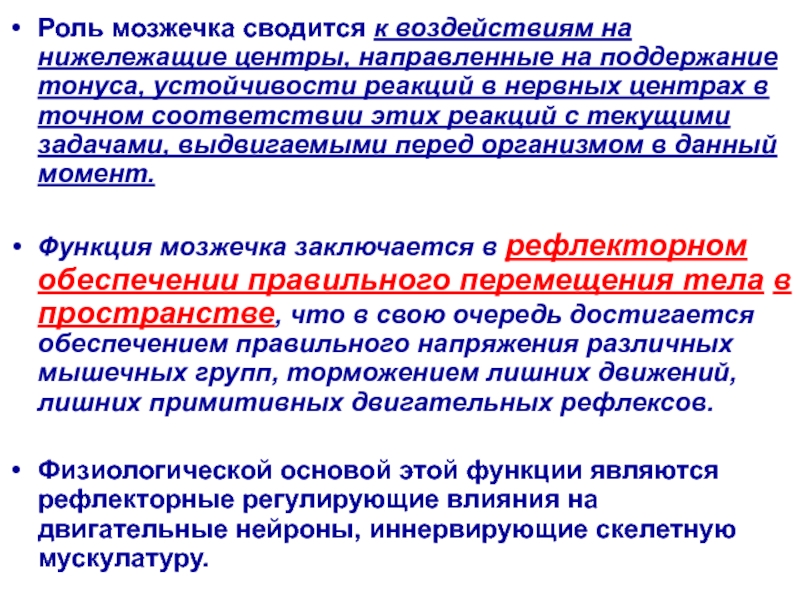 Слайд 44Роль мозжечка сводится к воздействиям на нижележащие центры, направленные на