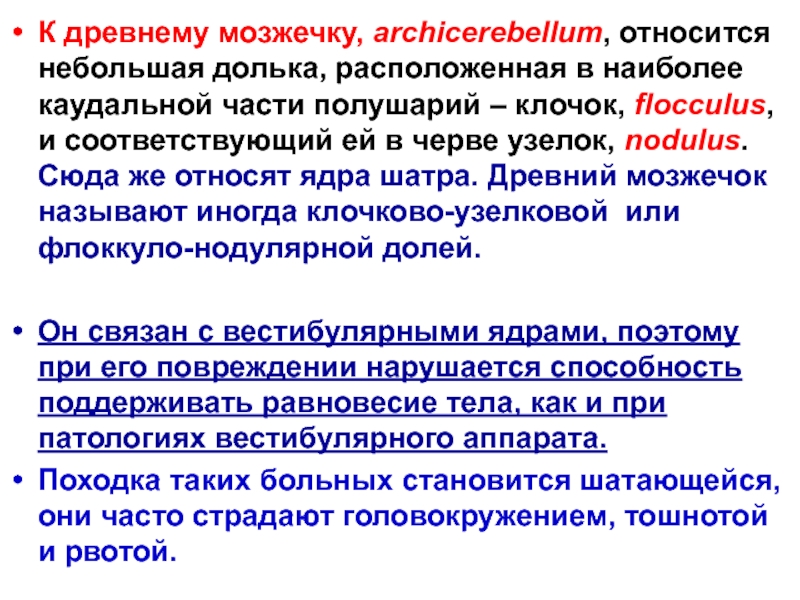 Слайд 35К древнему мозжечку, archicerebellum, относится небольшая долька, расположенная в наиболее