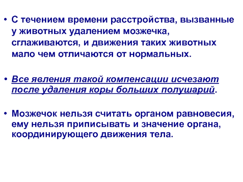 Слайд 43С течением времени расстройства, вызванные у животных удалением мозжечка, сглаживаются,