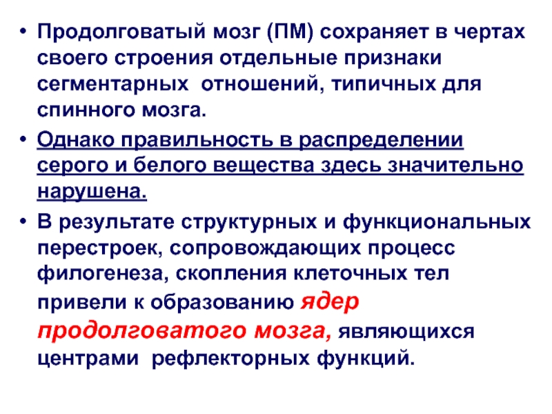 Слайд 4Продолговатый мозг (ПМ) сохраняет в чертах своего строения отдельные признаки