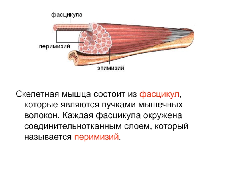 Скелетная мышца состоит из фасцикул, которые являются пучками мышечных волокон. Каждая фасцикула окружена соединительнотканным слоем, который называется