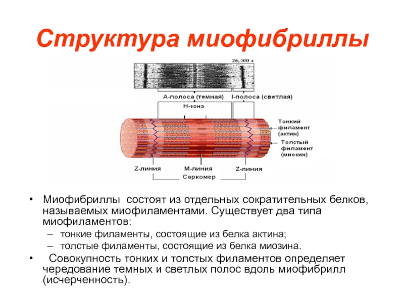 Миофибриллы состоят из отдельных сократительных белков, называемых миофиламентами. Существует