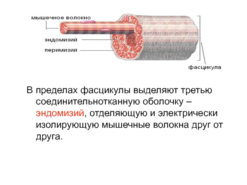 Слайд 10В пределах фасцикулы выделяют третью соединительнотканную оболочку – эндомизий, отделяющую