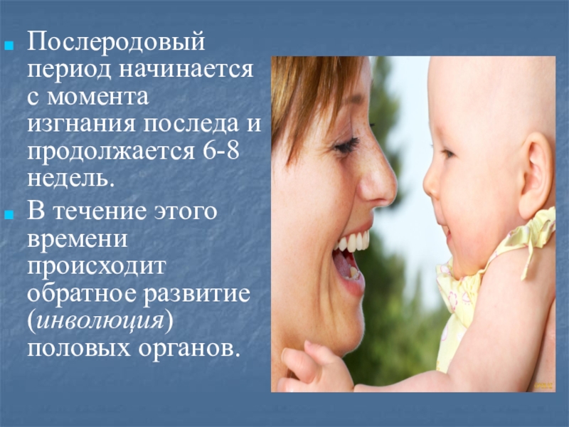 Слайд 2Послеродовый период начинается с момента изгнания последа и продолжается 6-8