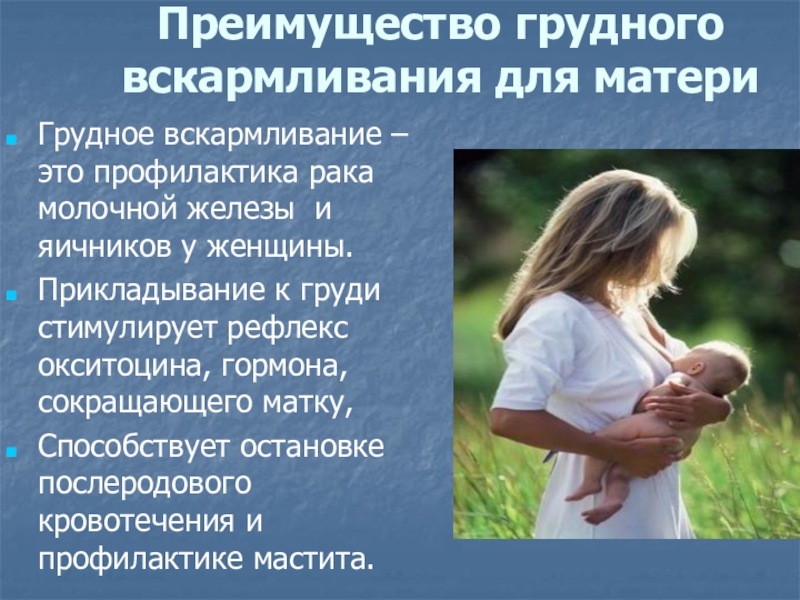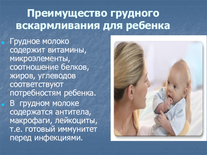 Слайд 13Преимущество грудного вскармливания для ребенка