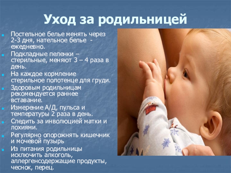 Из питания родильницы исключить алкоголь, аллергенсодержащие продукты, чеснок, перец.
