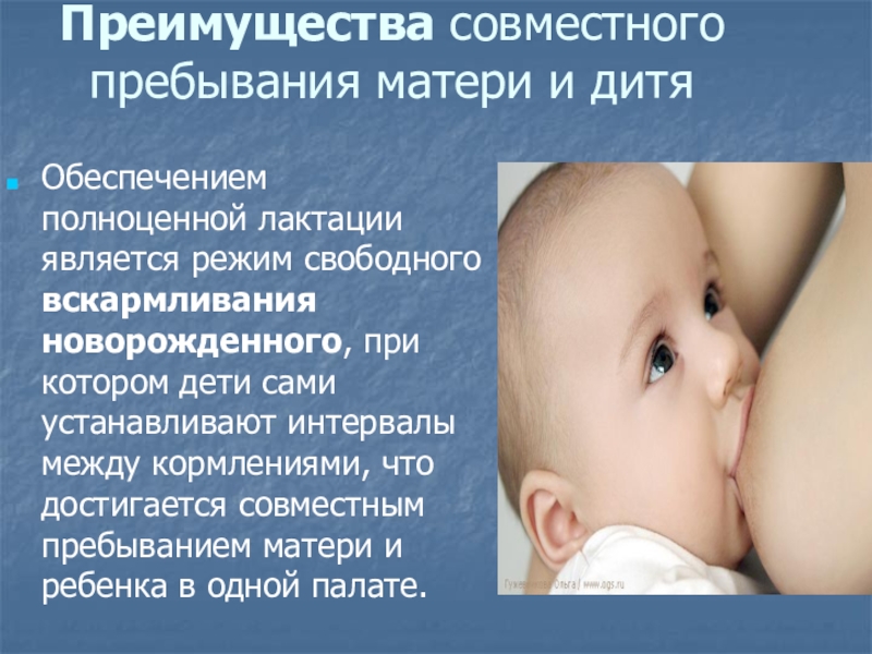Совместное пребывание и грудное вскармливание по требованию ребенка оказывают положительное влияние на лактацию, течение послеродового и неонатального периода.