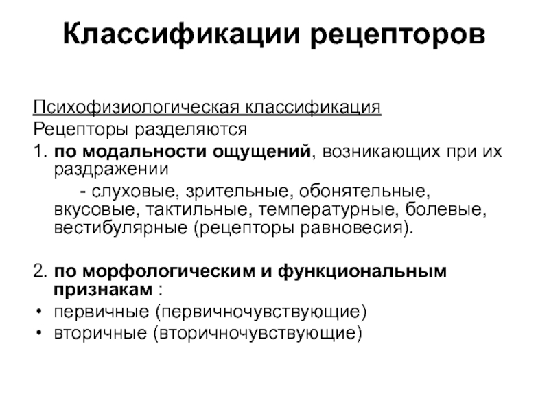 вкусовые, тактильные, температурные, болевые, вестибулярные (рецепторы равновесия).