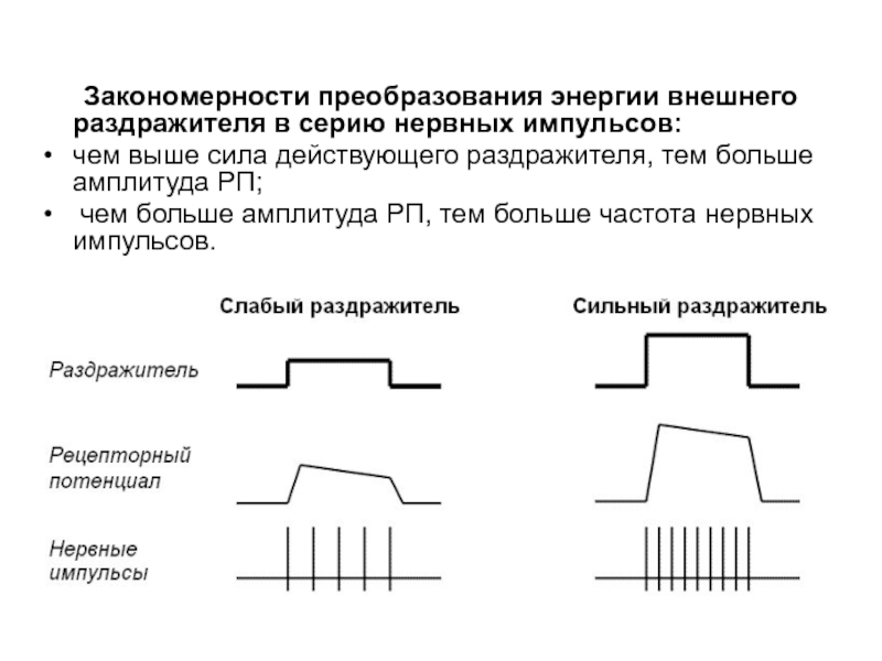 Слайд 18 Закономерности преобразования энергии внешнего раздражителя в серию нервных импульсов: