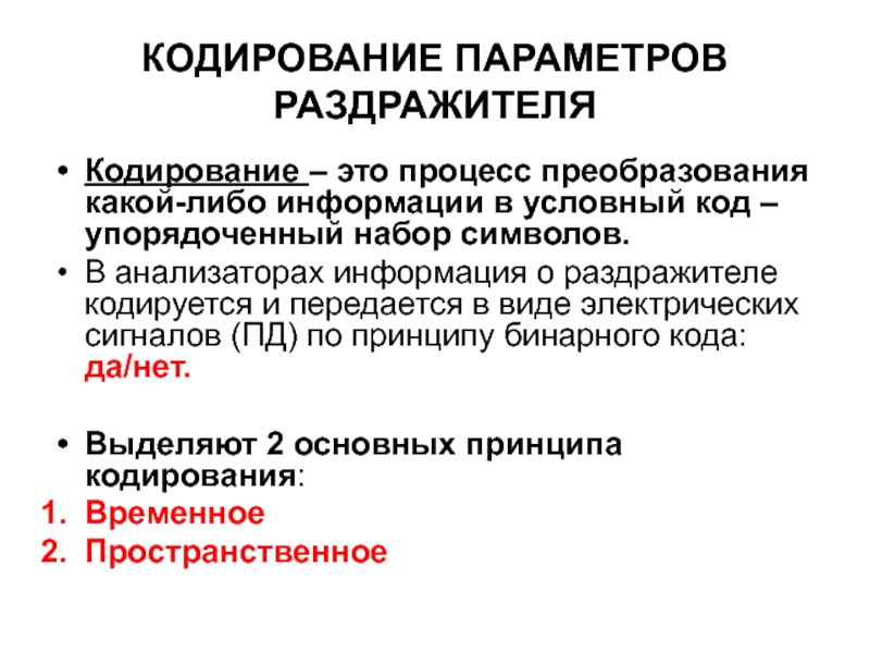 Слайд 19КОДИРОВАНИЕ ПАРАМЕТРОВ РАЗДРАЖИТЕЛЯ