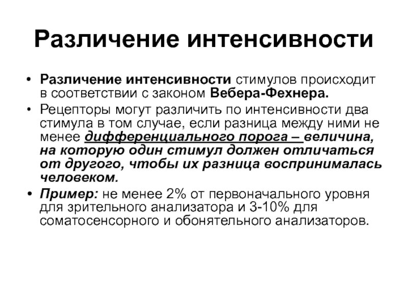 Рецепторы могут различить по интенсивности два стимула в том случае,