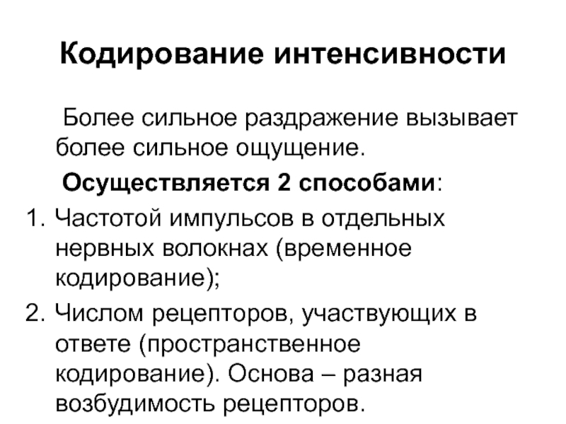 ответе (пространственное кодирование). Основа – разная возбудимость рецепторов.