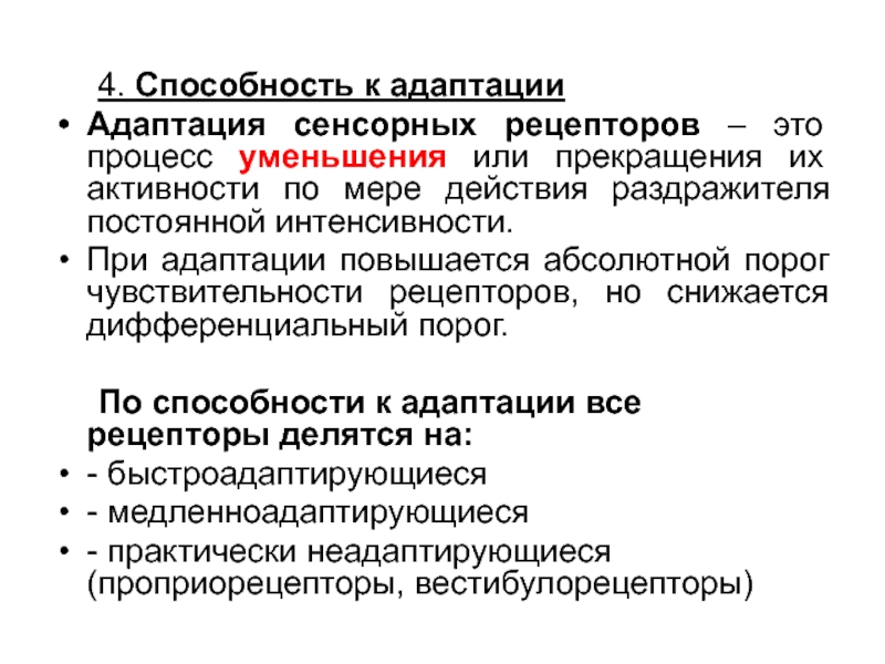 При адаптации повышается абсолютной порог чувствительности рецепторов, но снижается дифференциальный порог.