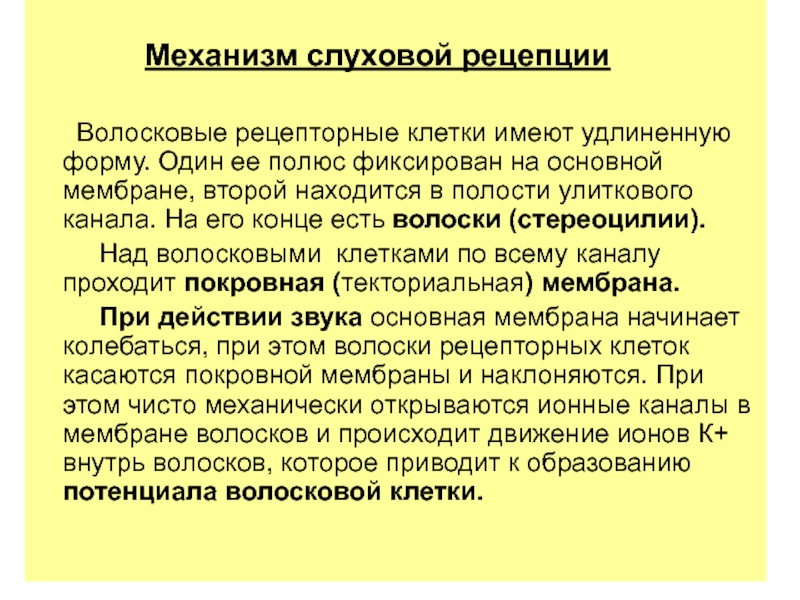 При действии звука основная мембрана начинает колебаться, при этом волоски рецепторных клеток касаются покровной мембраны и наклоняются. При этом чисто механически открываются ионные каналы в мембране волосков и происходит движение ионов К+ внутрь волосков, которое приводит к образованию потенциала волосковой клетки.